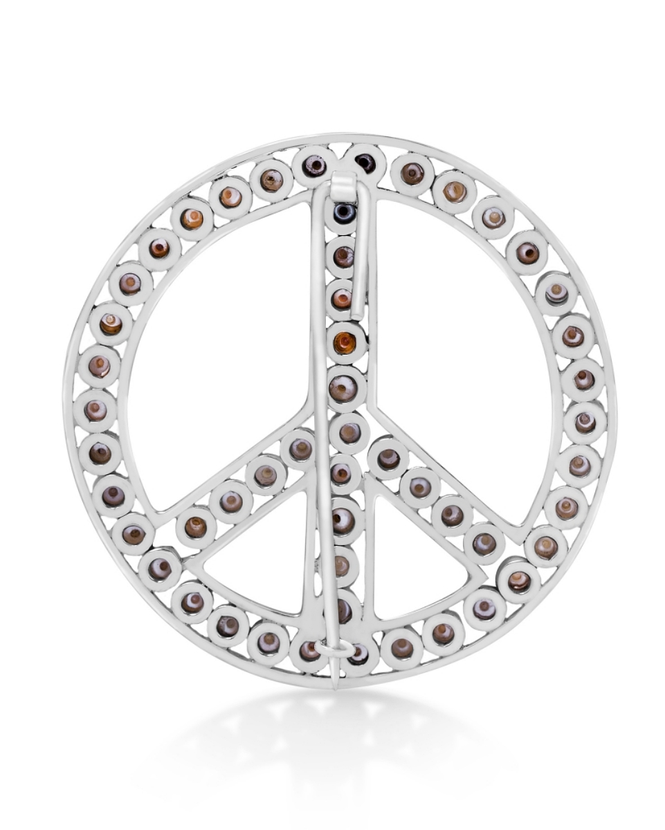 An ornate peace brooch encrusted with delicate pearls dotted along the rim. This piece is crafted from sterling silver. Pin yours to everything from blazers to dresses.